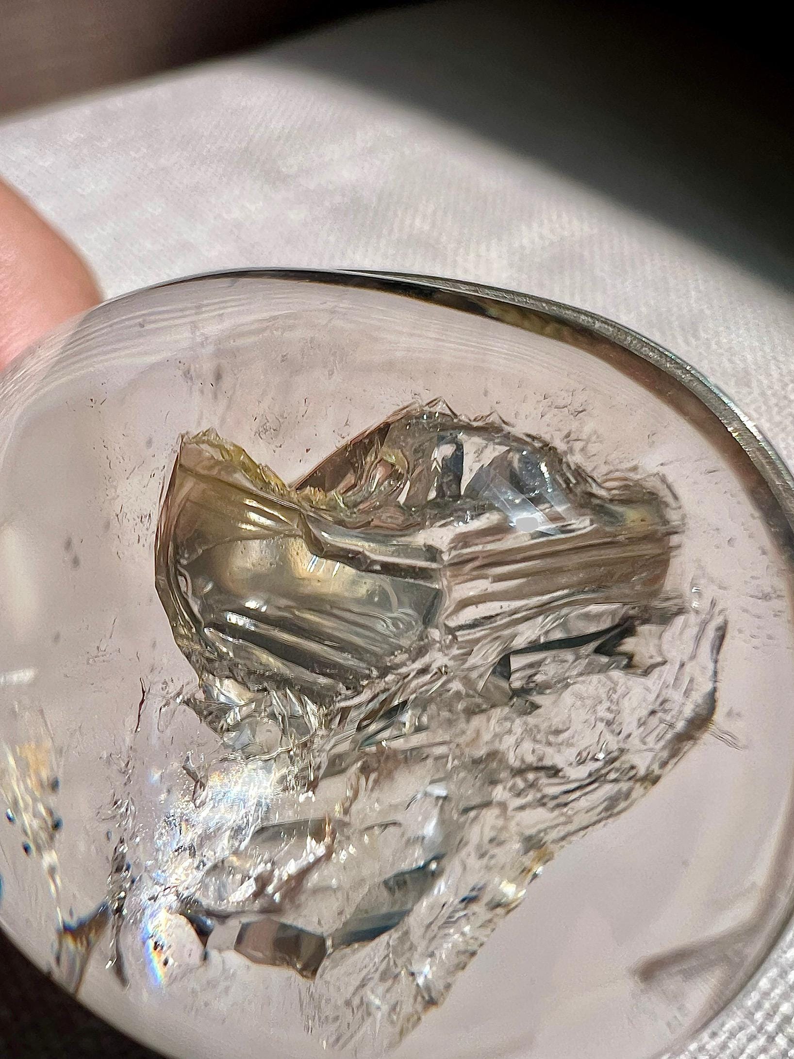 Second, based on our trips to mineral markets in Brazil, Madagascar, Tanzania, China etc…, while we regularly see man-made enhydros, they remain RARE and quite pricey due to the numerous and costly steps required to make one: drill the crystal, filling with a liquid, sealing the opening with some sort of epoxy material, polishing to hide the alteration. That’s a lot of work, thus their high prices.